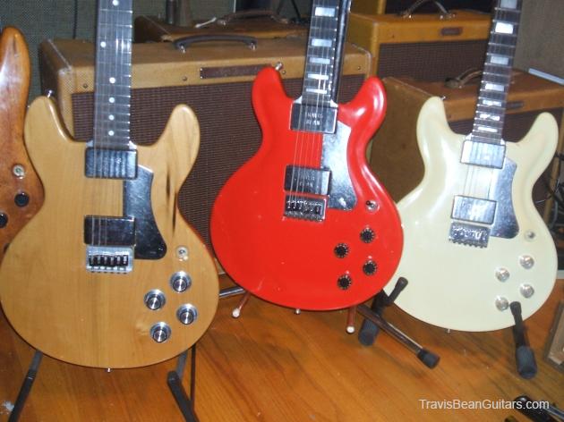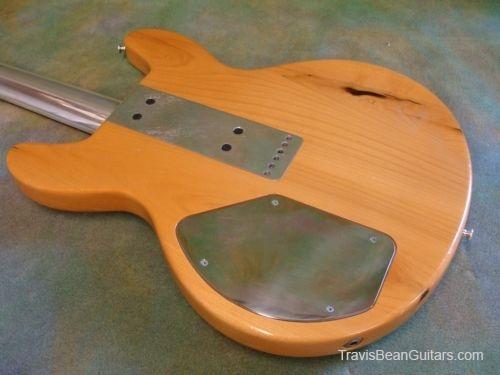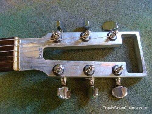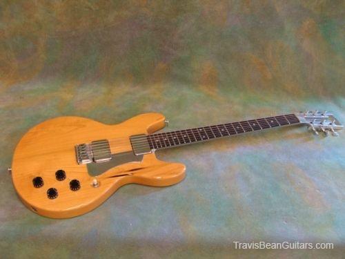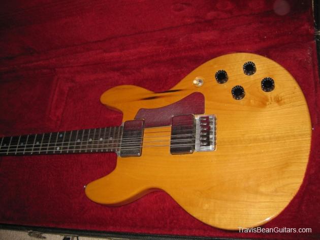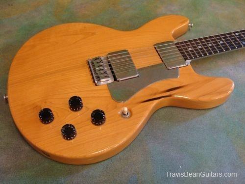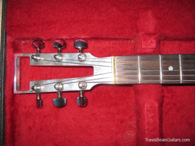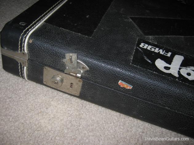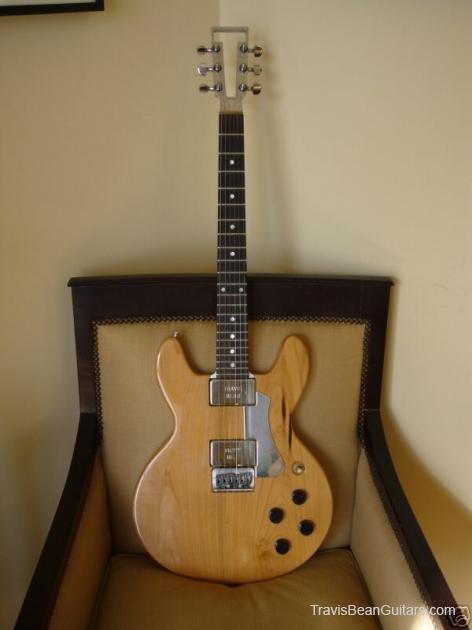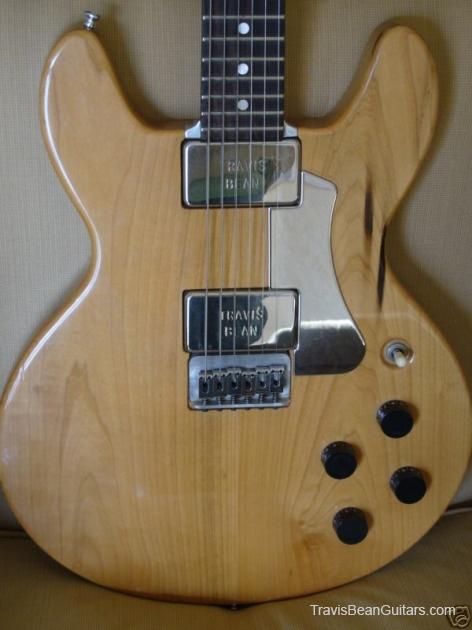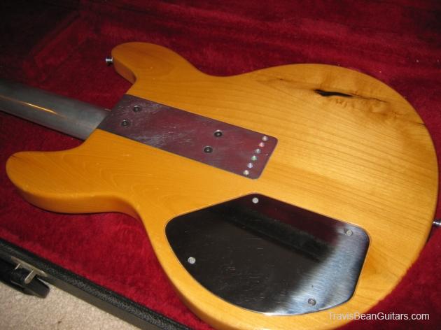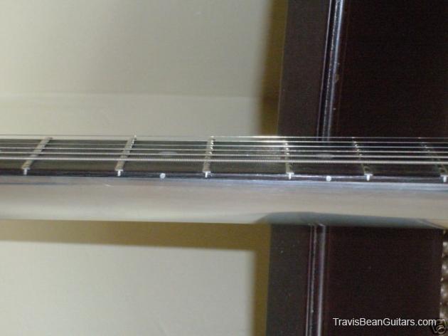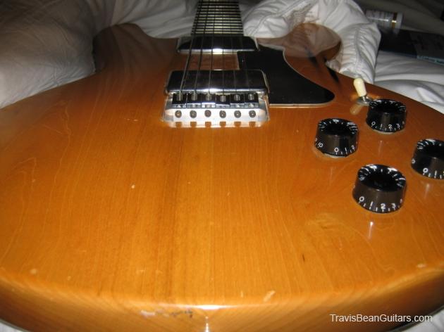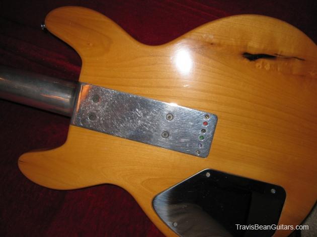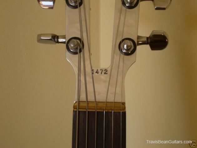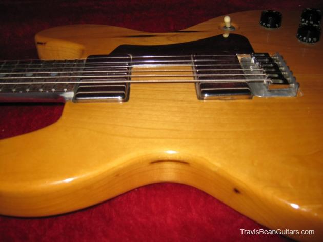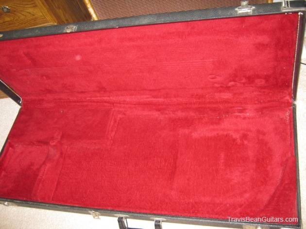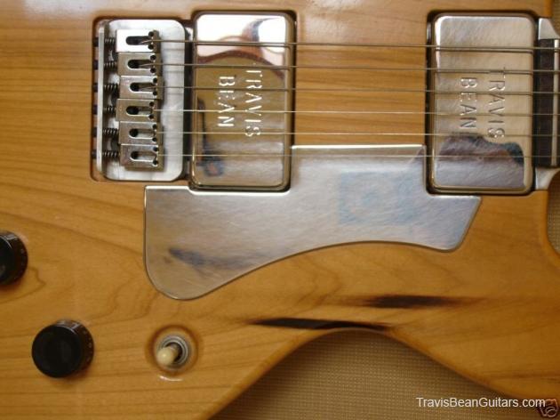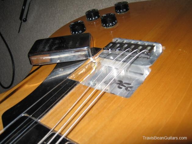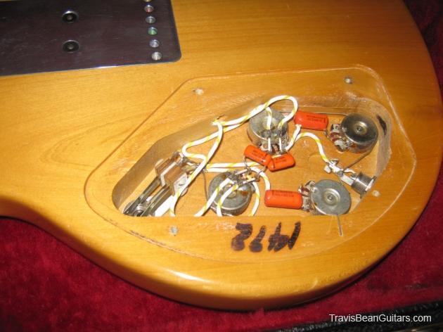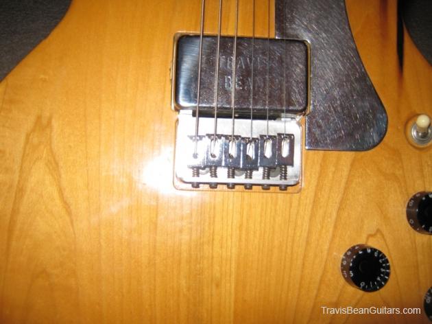 POPLAR wood (so I was told). Excellent condition with minor buckle rash. As shown in photos this guitar has a strange anomaly. The part of the body where the bridge/saddle tray would sit has been cut away. The metal saddle is much thicker than on most TB guitars and it sits directly on the neck. This appears to be very professional work, and it would surprise me to learn that it was not done in-factory. The wood is just cut too clean and there is finish on the wood where you can see the sides. Also, the saddle piece was obviously fabricated in a metal shop and to make something like this would be no easy task. On the other hand, I have not seen another TB guitar with a saddle like this. I simply feel that to modify a guitar in this way would be such an expensive and monumental task that it hardly seems worth the effort. This configuration seems to add sustain and perhaps it was tried one time as an experiment. Inside the neck is written "spec fret" so, this is another hint that it could have been done in-house. If anyone has a theory or opinion about this, please email the site admin so we can try and determine why this saddle was made in this manner.