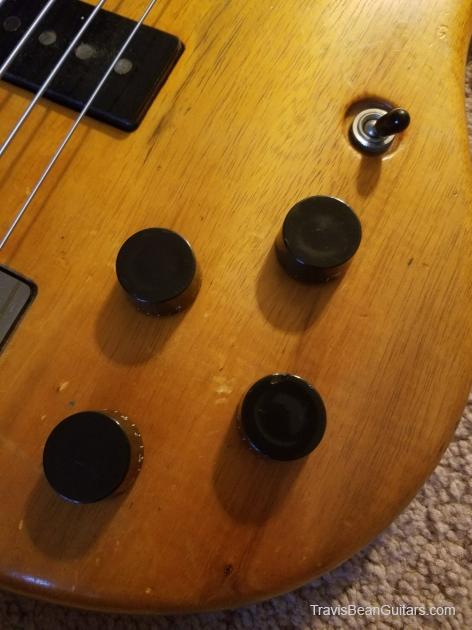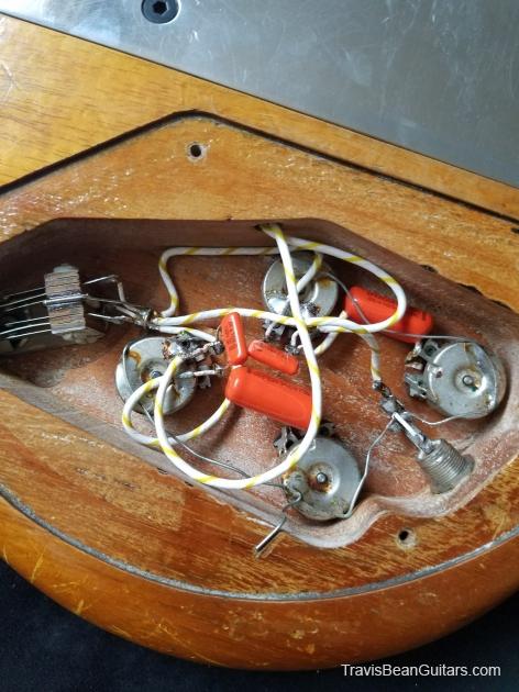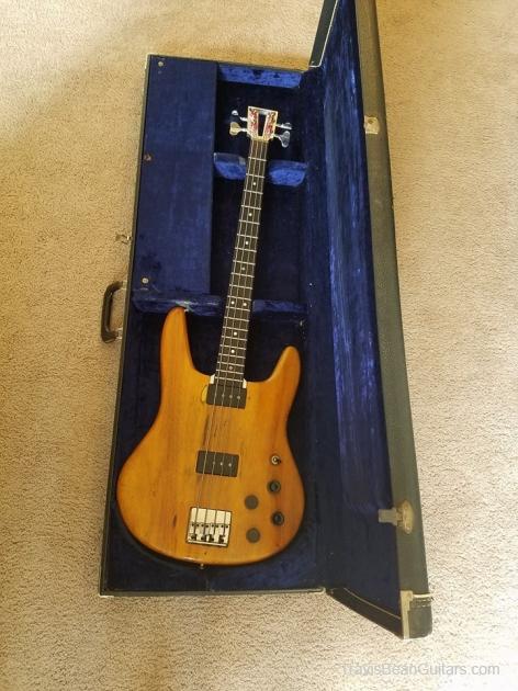 Description:   Grover tuners, one slightly chipped tone knob, visible gouge in wood just above neck pickup. Bridge saddle screws have been replaced, nut has been shaved down to accommodate heavy strings. Purchased in Sept. '17, original case included.