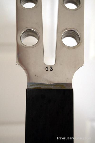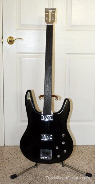 I inherited this guitar from my late brother, Richard "Obe" Oblinger, who was a Travis Bean employee from 1975 until 1979. It is a black painted fretless bass with an ebony fingerboard. Serial no. 13. On the back of the neck base is the inscription "17 May, 1975 for Richard Oblinger" and is signed "Travis Bean '75" and "Marc McElwee". May 17, 1975 was my brothers 25th birthday.