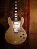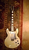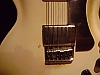 Description:   original white finish artist with black knobs, some finish discoloration and playing wear, slight checking around neck, two small drilled and filled holes, one each on either side of the bridge, yellowed rectangular sticker shadow below bridge.