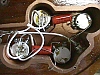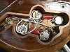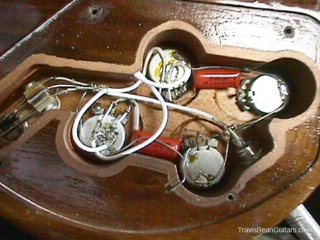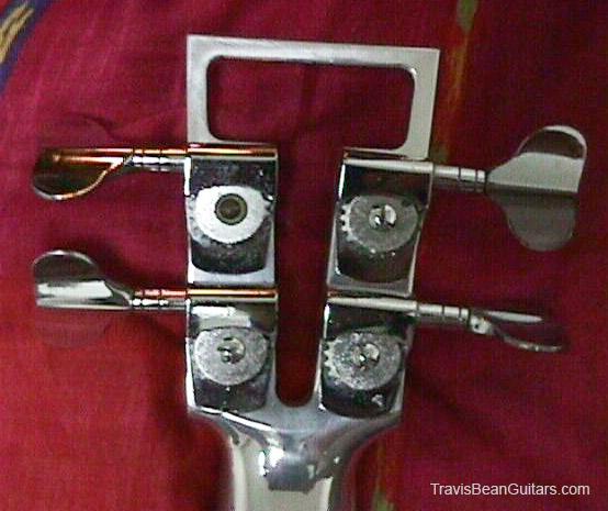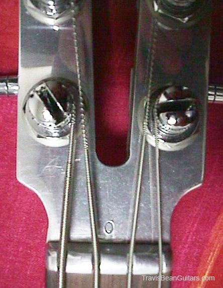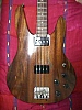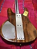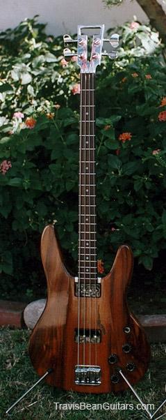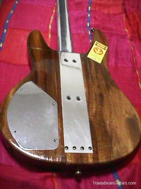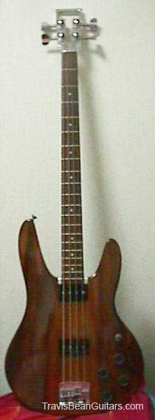 First prototype. Sides are squarer, body contour slightly different, neck is hand carved, flatter, and isn't hollowed out like most production models. The headstock is longer than production models (similar to the guitars.) Aluminum nut. Being a massive 14 pounds, it is a back breaker, but the sound has more low end than other TB basses!
