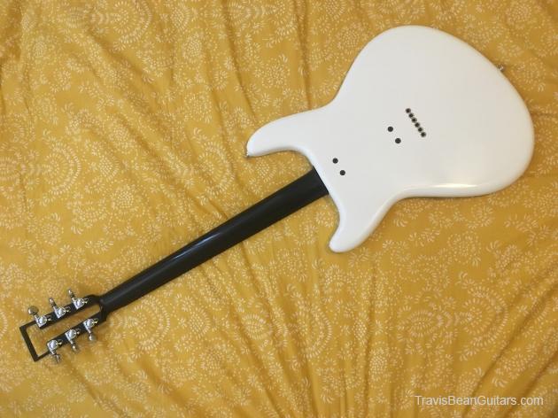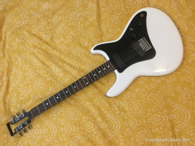 Refinished paint was carefully removed. Original white paint was touched up and new clearcoat added on top. Replacement knobs were sourced. Fingerboard was re-glued as it had been glued on at an angle by a previous owner. Original frets were very worn and were replaced. Neck was re-coated in black gloss.