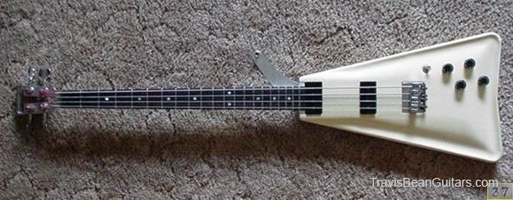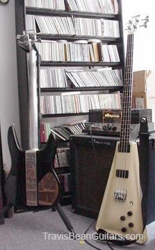 1977 Wedge, White (yellowing with age), 1 pc fingerboard. Previous owners I know of are Bill Kaman of Ovation Guitars, and a man named Flynn Adams. I discovered a sticker on the flight case that was hidden under another sticker (which was a characture of a guy playing the wedge), and the name "Flynn Adams" was also on the sticker. Apparently he plays bass all over Asia, and now plays bass for an ex-Ricky Martin backup singer. The only unusual thing about the bass is an aluminum "swing arm" that someone attached to the back of the neck (see pic). It swings out until resting on a circular "stopper", and has a strap button on the end. When extended, it places the strap button just about where the strap button on a standard body is (over the 14th fret) and perfectly balances the bass. I purchased it from Gruhn Guitars (apparently it was on consignment from Bill Kaman...) and I had them fit a new brass nut so the bass could be strung lefty. I may have the only lefty TB4000 in the world :) Has the original anvil case as well. Someone who owned it before me left it in the case for a long time, and the foam fused in to the paint. Bill Kaman wet sanded the body to get as much of the foam out of the paint as he could, but there is still a lot there. Funny that Gruhn didn't mention that to me over the phone when they did their "hands-on description".