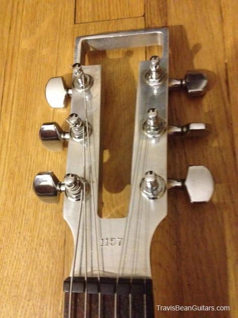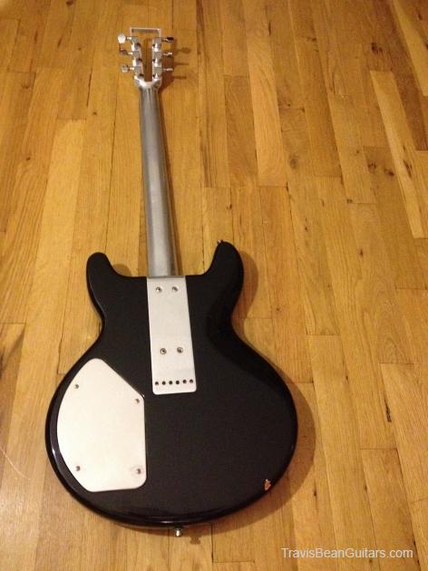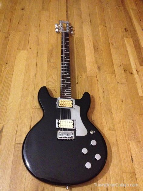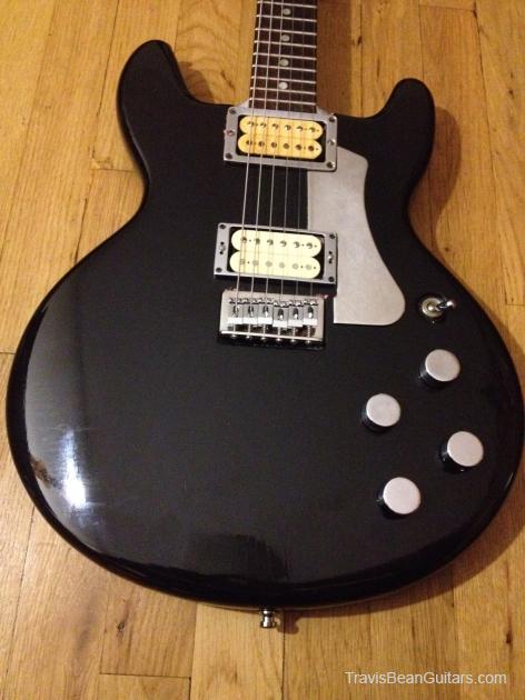TB1000s number 1157. Refinished Black over Red. Lower Horn shortened and waist contour added. Non-original Pickups, secured in place by added wood blocks and wood piece inside neck cavity.