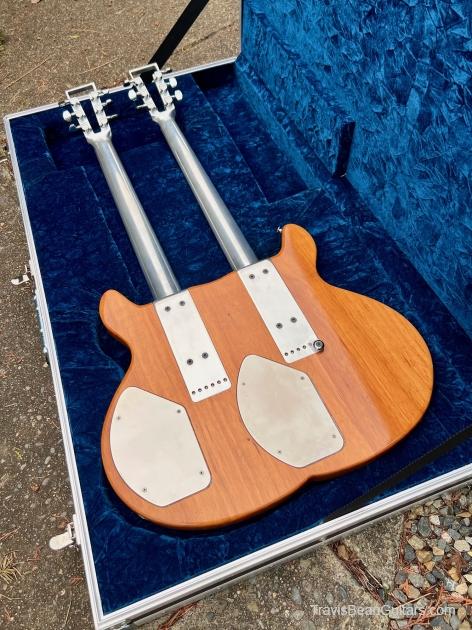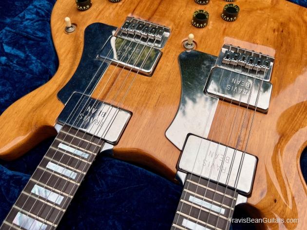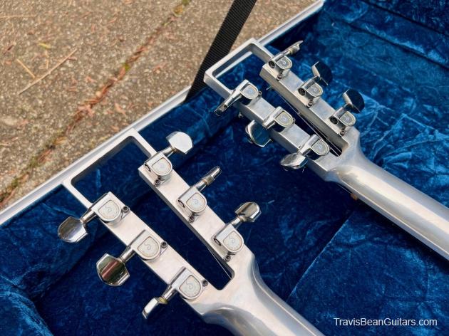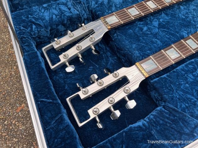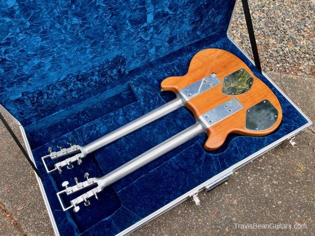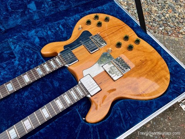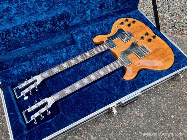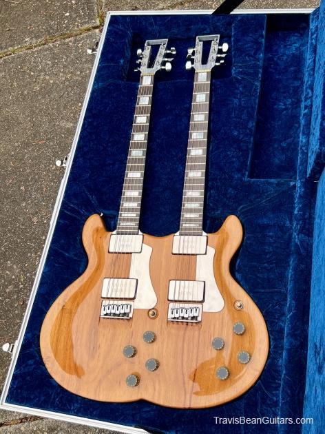 Early 1977 one-off Artist doubleneck. Both necks stamped #1 although not the first Artist built. Has the smaller block inlays than the doubleneck red Wedge built sometime earlier. Spoke with Marc McElwee about this and he stated it’s double six necks were for having an alternate tuning as well as it being the only one built. Weight is surprisingly 16 pounds, rear strap button is directly under the bridge to offset the neck balance.