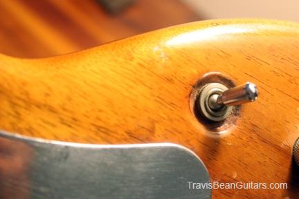I replaced the toggle switch cap with Gibson white toggle switch cap. The knobs were replaced with original (previously used) bottle top knobs.