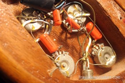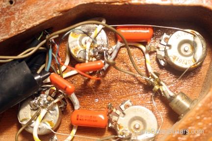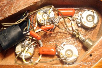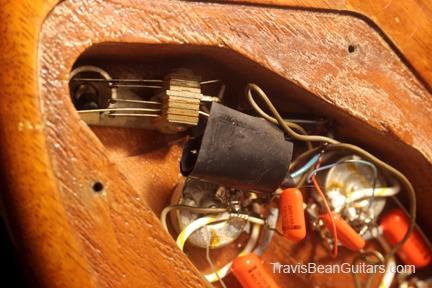 Next was to tie into the bridge pickup lead. As you can see in the photos, the bridge pickup was cut extremely short (3/4") tail. I used similar teflon pickup lead to tie to. I kept the lead long so I could remove the pickup without stressing out the connection close to the actual pickup. I cleaned out all the non-original wiring in the electronics area and things cleaned up nicely.