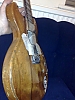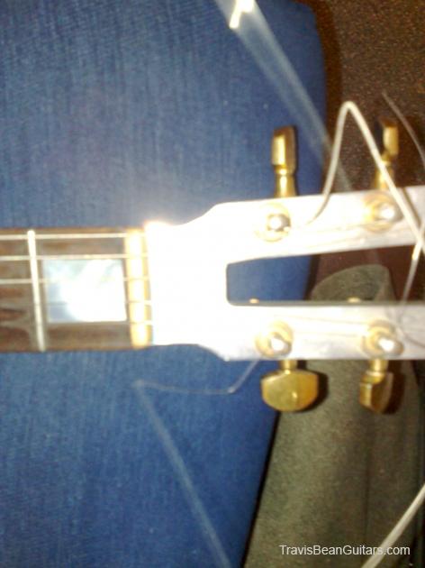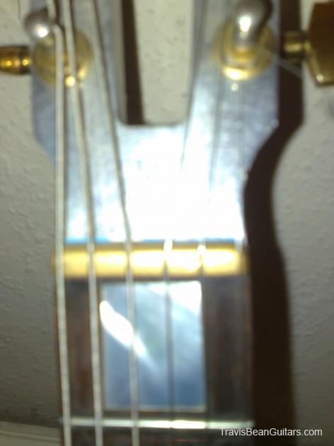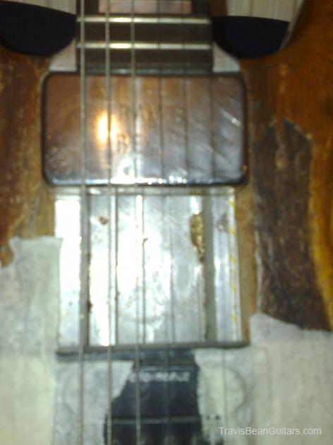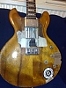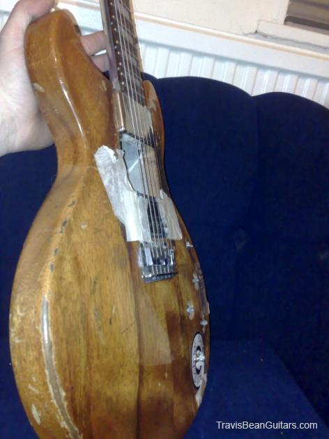 bought for nothing in near derelict condition - wood between the two pickups has literally been carved out with a hack saw. original bridge pickup not there, something called a 'performance' in its place. loots dents. 'do what thou wilt' (?) craved into the t in the headstock. amusingly it still works and is my favourite guitar.